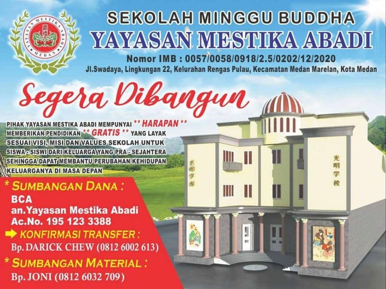 Kami dari Pengurus Yayasan Mestika Abadi, dengan segala kerendahan hati menyampaikan maksud tujuan untuk mendirikan Sekolah Minggu Buddha (SMB), yang akan dilanjutkan dengan jenjang kependidikan formal, mulai dari PAUD (Playgroup, TK-A & TK-B), SD, SMP dan SMA.